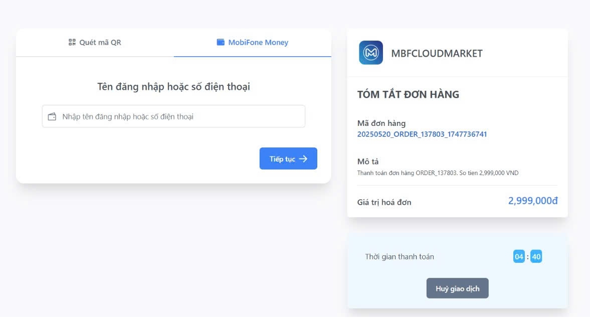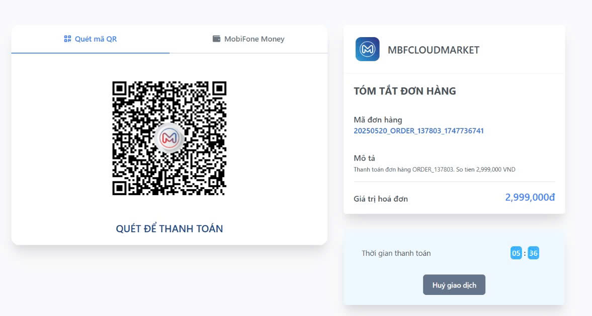 Giao diện thanh toán bằng mã QR Mobifone Money
